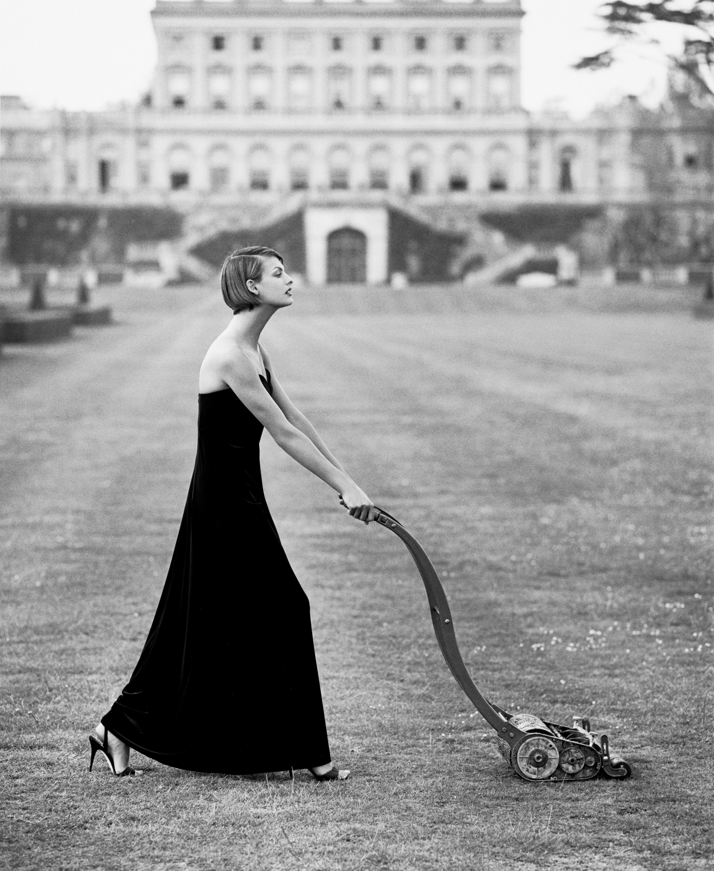 Linda Evangelista with lawnmower